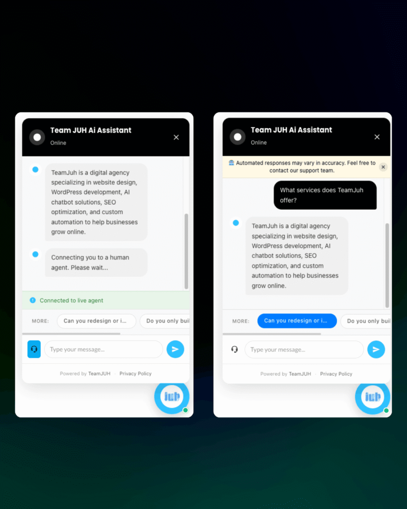 - Live Agent Handoff – Seamless transfer from AI to human agents with email notifications